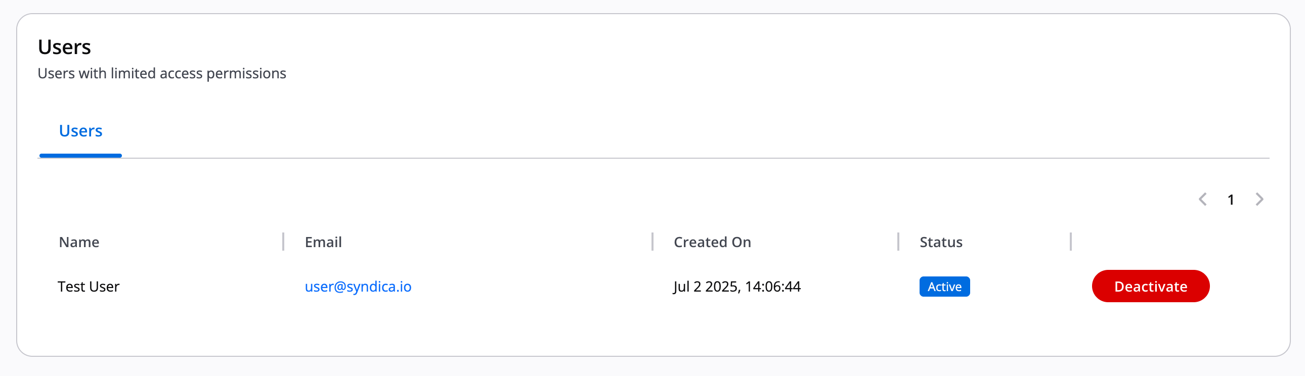 If you need to deactivate a user, you can do so from the Teams section. For each active user in the Users table, you'll see their name, email, status, and a deactivate button (pictured below)