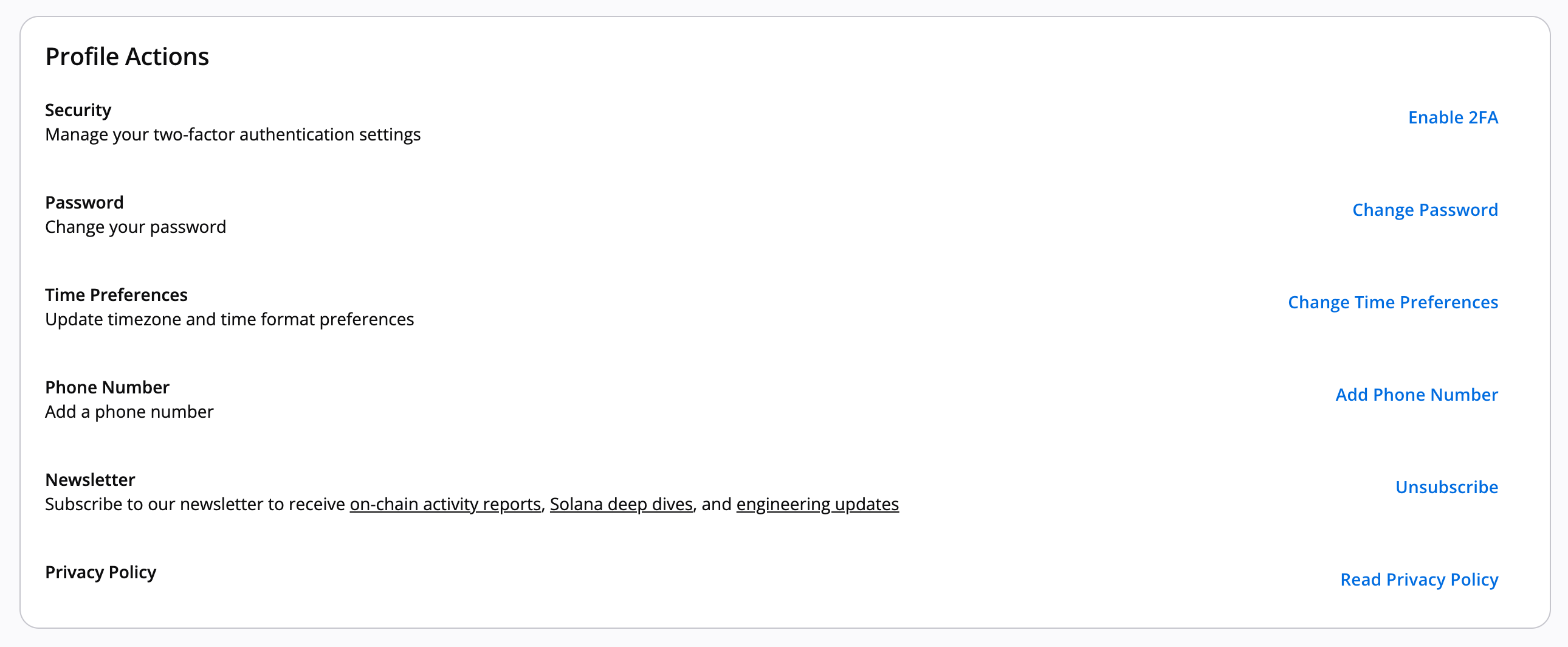 Two-factor authentication lives in the Profile section of the Manage panel.